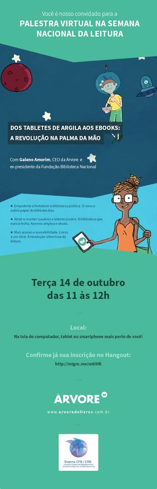O convidado para falar sobre o tema – com a palestra “Dos tabletes de argila aos eBooks: a revolução na palma da mão” – é o ex-presidente da Fundação Biblioteca Nacional Galeno Amorim, autor de pesquisas sobre o assunto e CEO da Árvore, que já opera em mais de 300 bibliotecas em 26 estados. Segundo pesquisa do Observatório do Livro e da Leitura, que ele próprio coordenou, dois em cada três bibliotecários consideram que as novas tecnologias de empréstimo de livros devem atrair mais usuários às bibliotecas e, por isso, 97% deles estão dispostos a se engajar para promover os novos meios de leitura.
